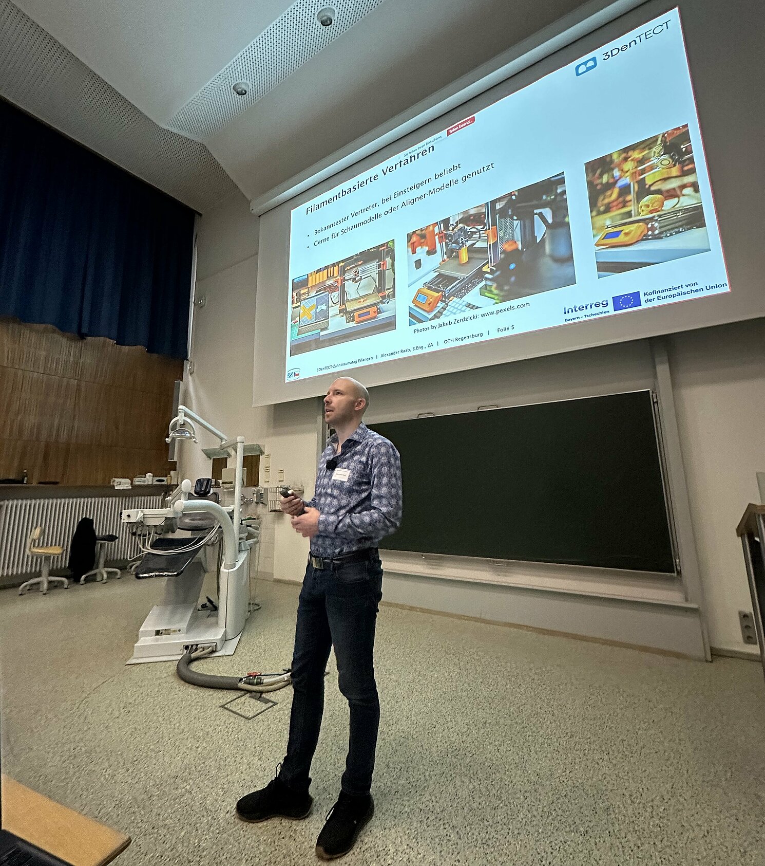 Im Rahmen des vom Labor für Medizinprodukte der OTH Regensburg geleiteten EU-co-finanzierten Projektes 3DenTECT (3D Dental Traumatology Education Community Transfer) zur Verbesserung der Versorgung von Zahnunfällen in der bayerisch-tschechischen Grenzregion fand am Freitag, den 20.03.26, der erste projektbezogene Zahntraumatag an der Klinik für Zahnerhaltung und Parodontologie des Universitätsklinikums Erlangen statt. Insgesamt über 75 Teilnehmende waren vor Ort oder online per Videoübertragung dabei und lauschten spannenden Fachvorträgen des Projektteams.